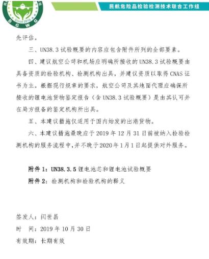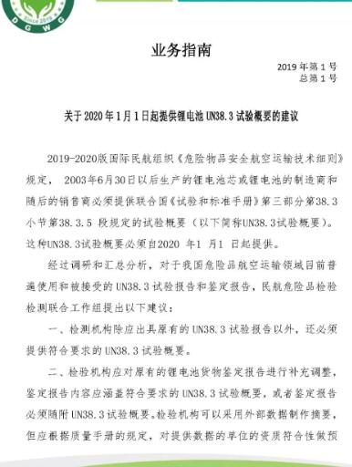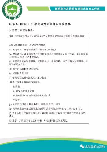 2019-2020版國際民航組織《危險物品安全航空運(yùn)輸技術(shù)細(xì)則》規(guī)定,2003年6月30日以后生產(chǎn)的鋰電池芯或者鋰電池的制造商和隨后的銷售商必須提供聯(lián)合國《試驗(yàn)和標(biāo)準(zhǔn)手冊》第三部分第38.3小節(jié)第38.3.5段規(guī)定的試驗(yàn)概要(以下簡稱UN38.3試驗(yàn)概要)。